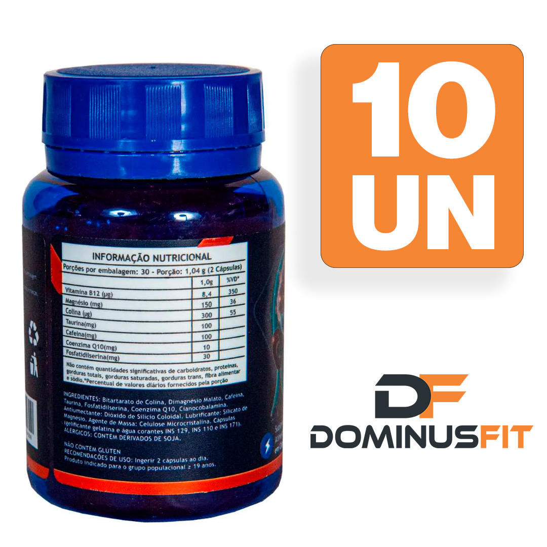 Ingredientes: Bitartarato de Colina, Dimagnésio Malato, Cafeína, Taurina, Fosfatidilserina, Coenzima Q10, Cianocobalamina. Antiumectante: Dióxido de Silício Coloidal. Lubrificante: Silicato de Magnésio. Agente de Massa: Celulose Microcristalina. Cápsula: gelatina, água, corantes INS 129, INS 110 e INS 171. ALÉRGICOS: Contém derivados de soja. Não contém glúten.