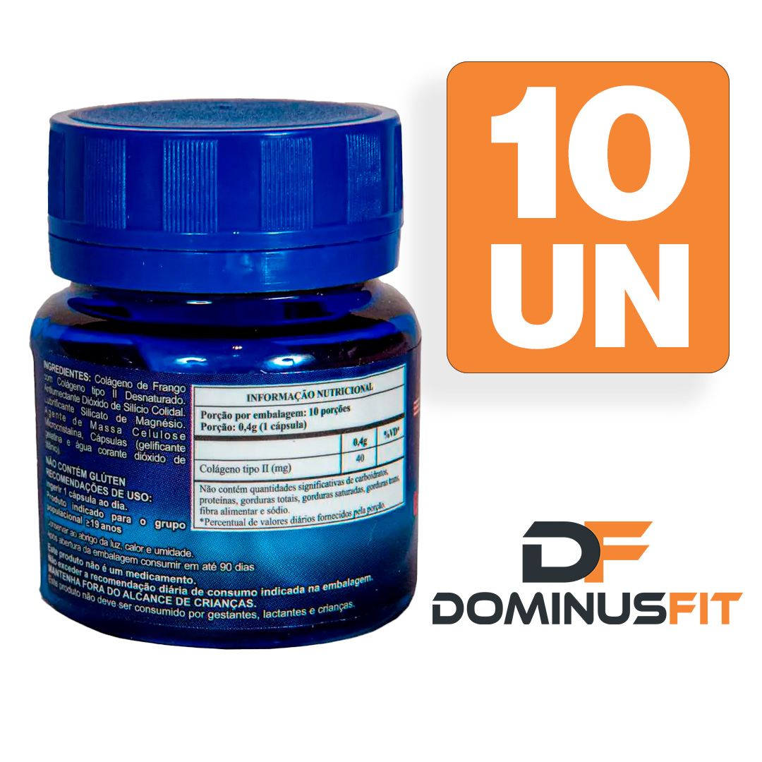 Ingredientes: Colágeno Tipo 2, excipientes (composição da cápsula). Não contém glúten.