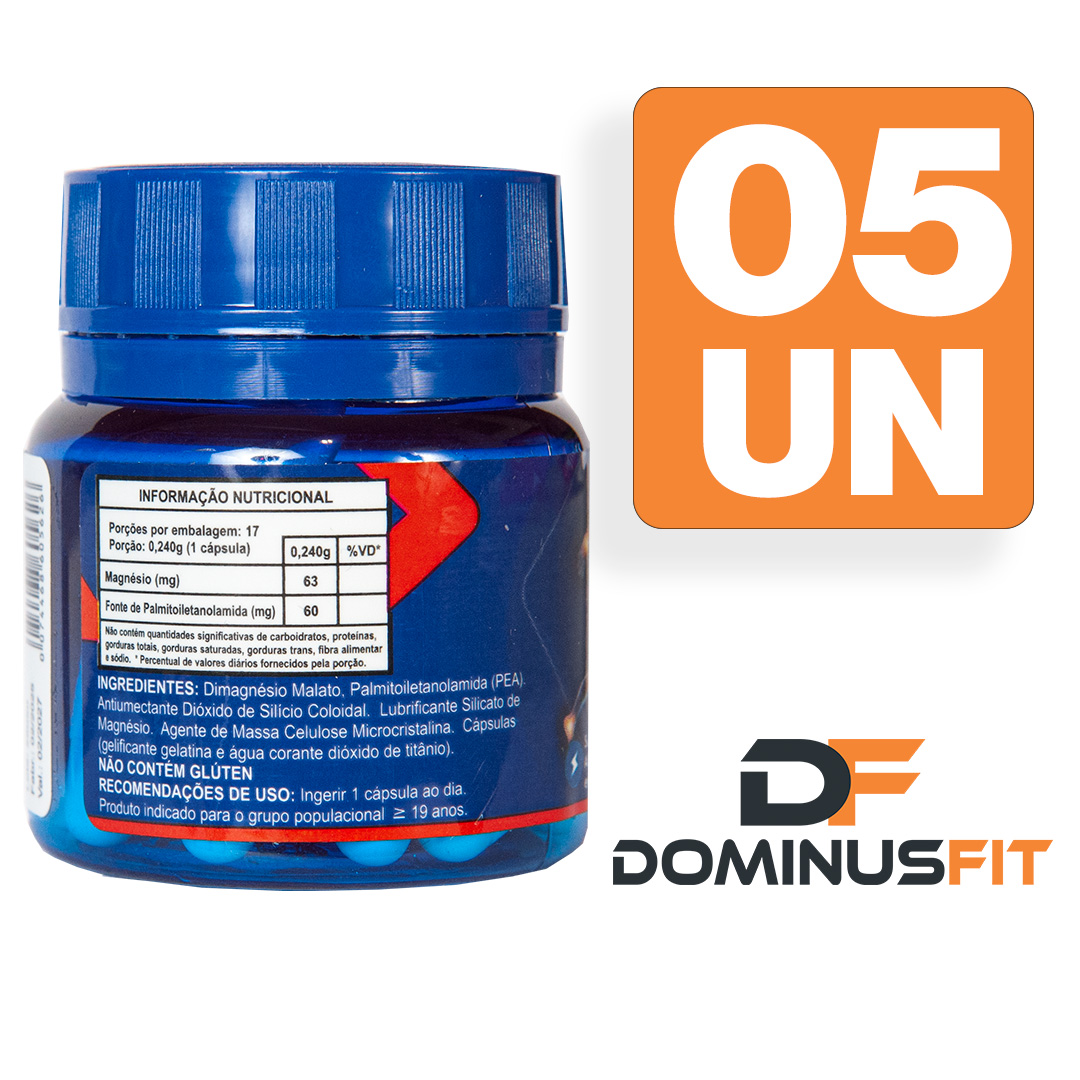 Ingredientes: Dimagnésio Malato, Palmitoiletanolamida (PEA). Antiumectante Dióxido de Silício Coloidal. Lubrificante Silicato de Magnésio. Agente de Massa Celulose Microcristalina. Cápsulas (gelificante gelatina e água; corante dióxido de titânio).