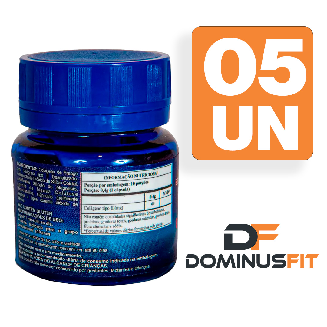 Ingredientes: Colágeno Tipo 2, excipientes (composição da cápsula). Não contém glúten.