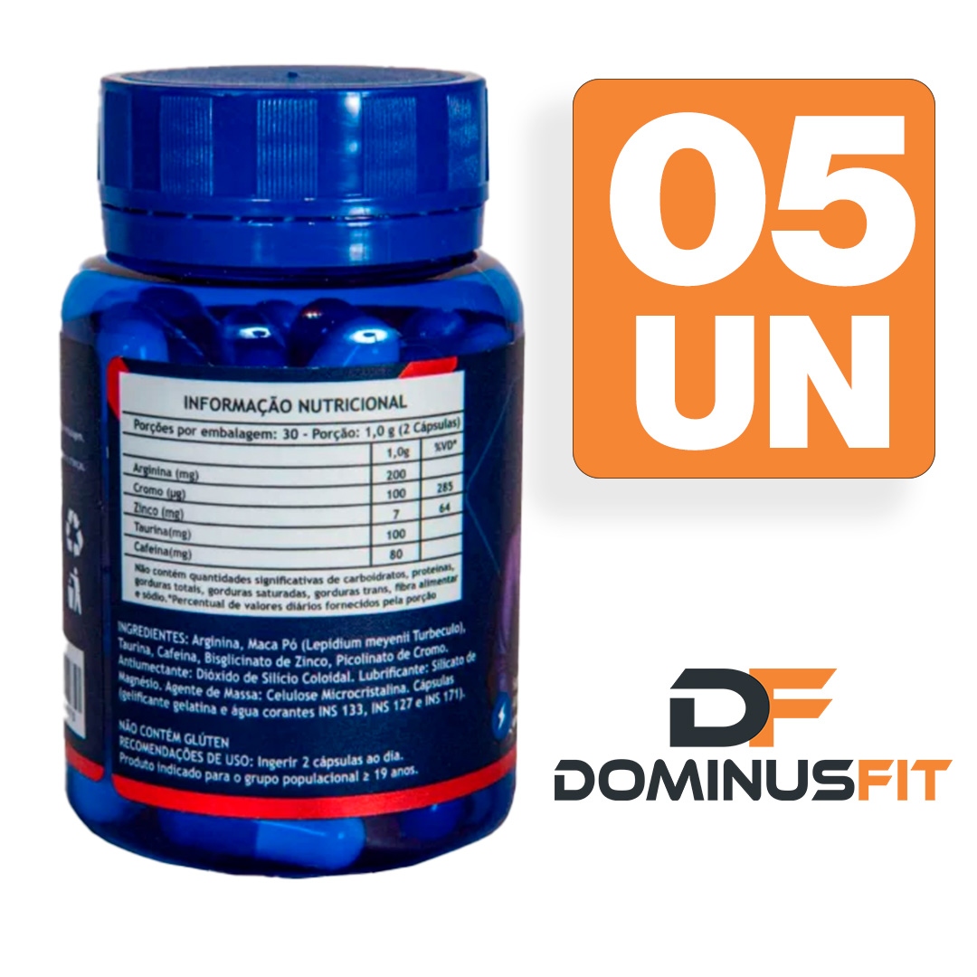 Ingredientes: Arginina, Maca Pó (Lepidium meyenii Turbeculo), Taurina, Cafeína, Bisglicinato de Zinco, Picolinato de Cromo. Antiumectante: Dióxido de Silício Coloidal. Lubrificante: Silicato de Magnésio. Agente de Massa: Celulose Microcristalina. Cápsulas (gelatina, água e corantes INS 133, INS 127 e INS 171). Não contém glúten.