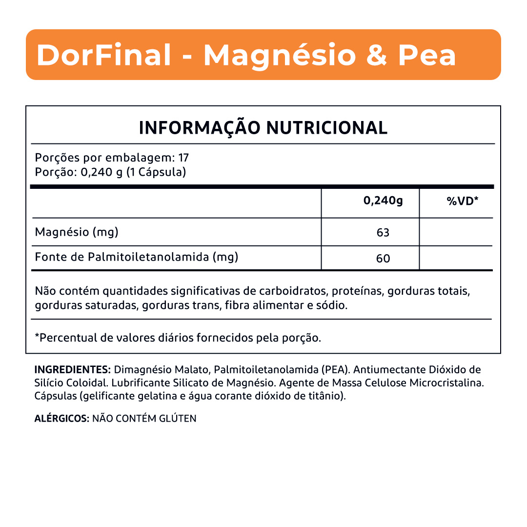 Alivie todas as suas dores com Dorfinal, um suplemento eficaz formulado com magnésio e palmitoiletanolamida (PEA) para combater diversas dores no corpo, melhorar o sono e promover a recuperação muscular. Cada frasco contém 17 cápsulas, oferecendo uma dose diária de componentes essenciais para o seu bem-estar.