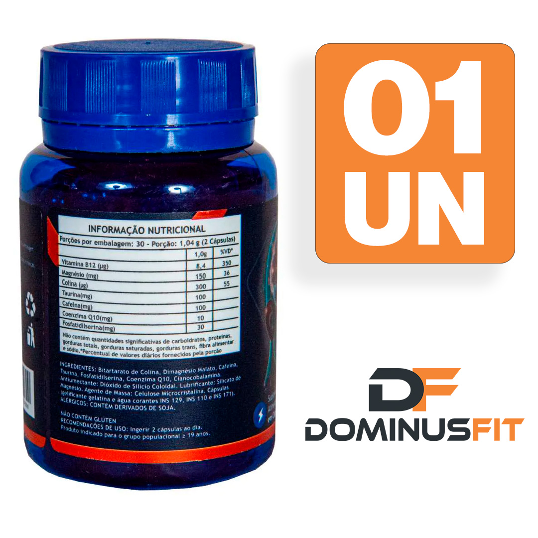 Ingredientes: Bitartarato de Colina, Dimagnésio Malato, Cafeína, Taurina, Fosfatidilserina, Coenzima Q10, Cianocobalamina. Antiumectante: Dióxido de Silício Coloidal. Lubrificante: Silicato de Magnésio. Agente de Massa: Celulose Microcristalina. Cápsula: gelatina, água, corantes INS 129, INS 110 e INS 171. ALÉRGICOS: Contém derivados de soja. Não contém glúten.